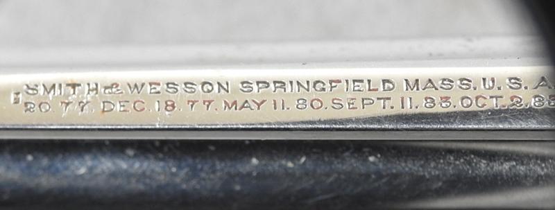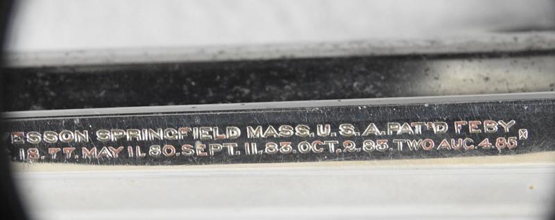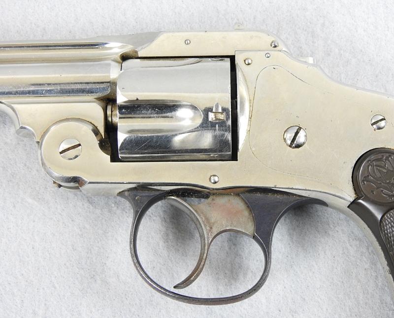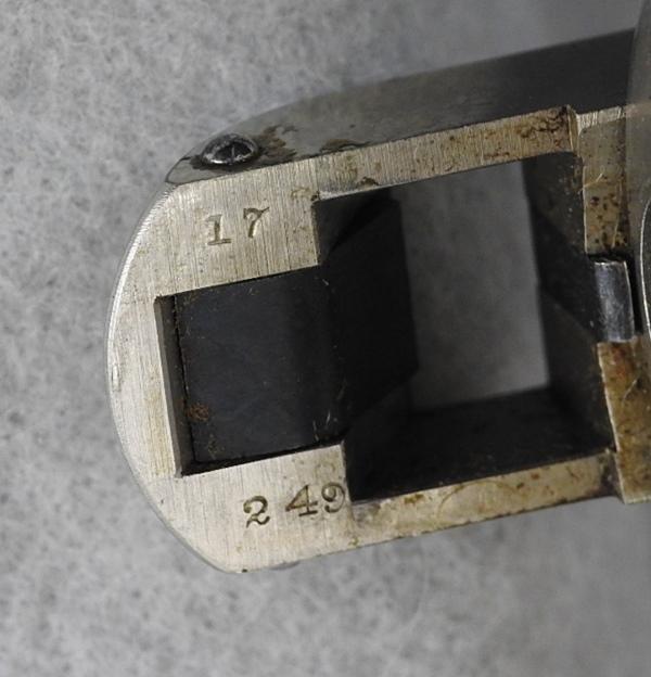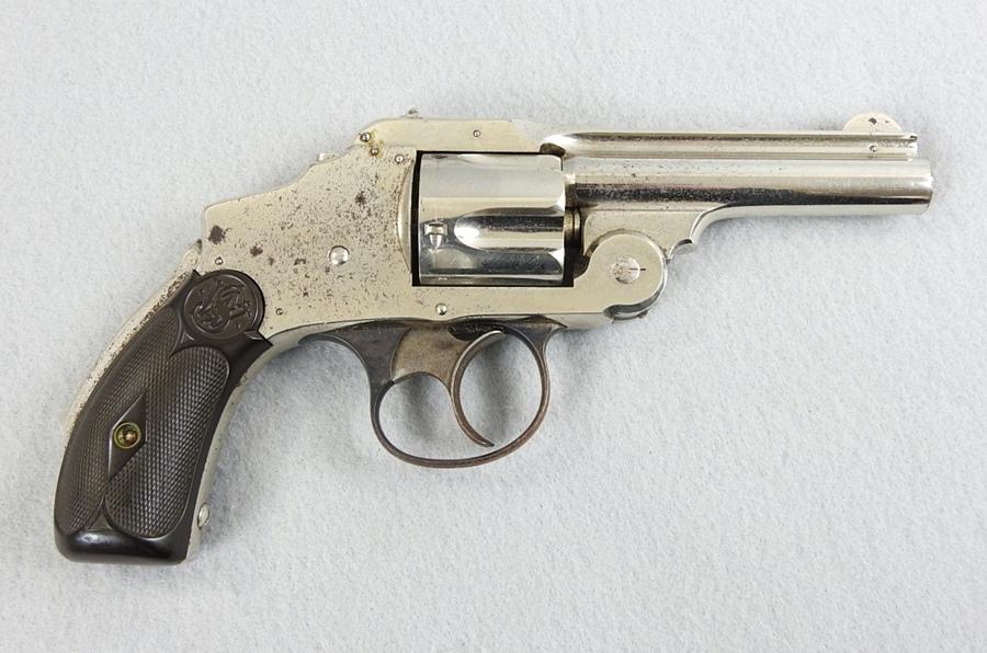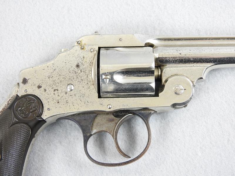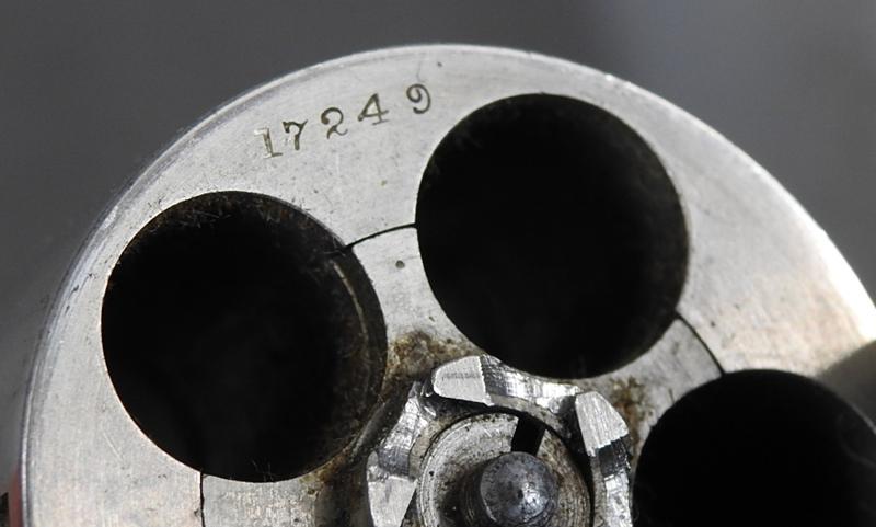 This was made about 1888 or 1889, and retains 85% nickel on the left side and 75% on the right side. Stored improperly. The mechanical function is very good crisp and tight and the bore has three small spots of corrosion on the left middle side. The serial number is 17249 and is matching numbers. The grips are very fine condition, no chips or cracks. The serial number is17249 and is matching numbers. This was made in about 1888.