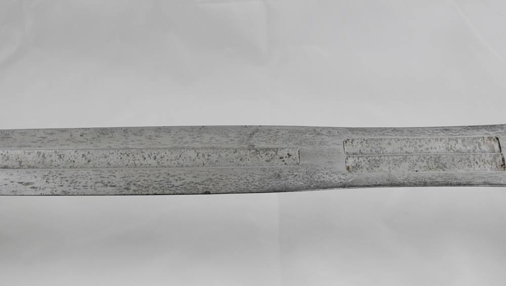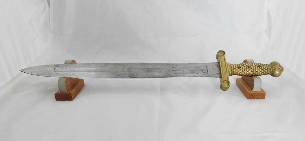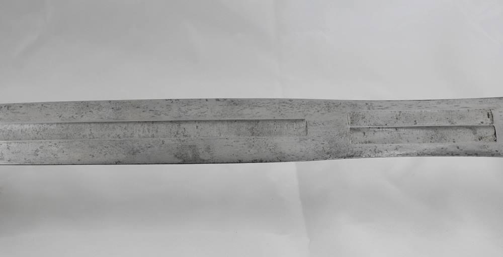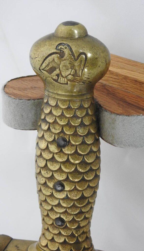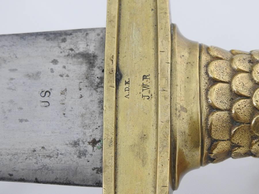 This Ames Foot Artillery Sword is not dated and does not have the American Eagle on either side. One side is marked US over A.D.K. and the other side has AMES MFG CO CHICOPEE MASS. The cross guard is inspected by A.D.K. A.D. King and J.W.R. is James W. Ripley. The blade has fullers on both sides and is 19 3/8” and is 25 5/16” overall in length. No scabbard come with this one. The blade is in nice condition with light stains on both sides.