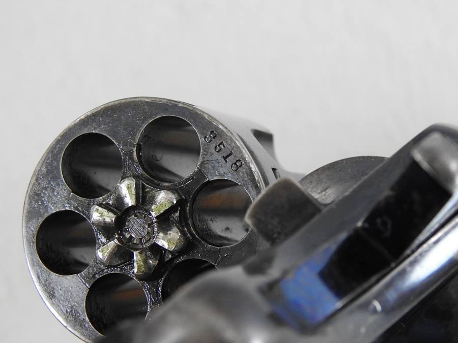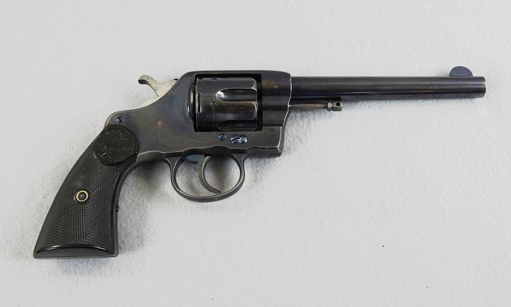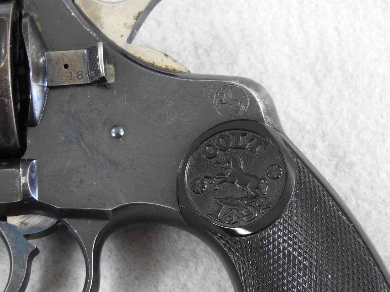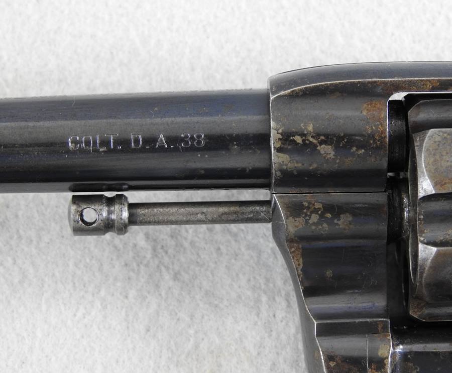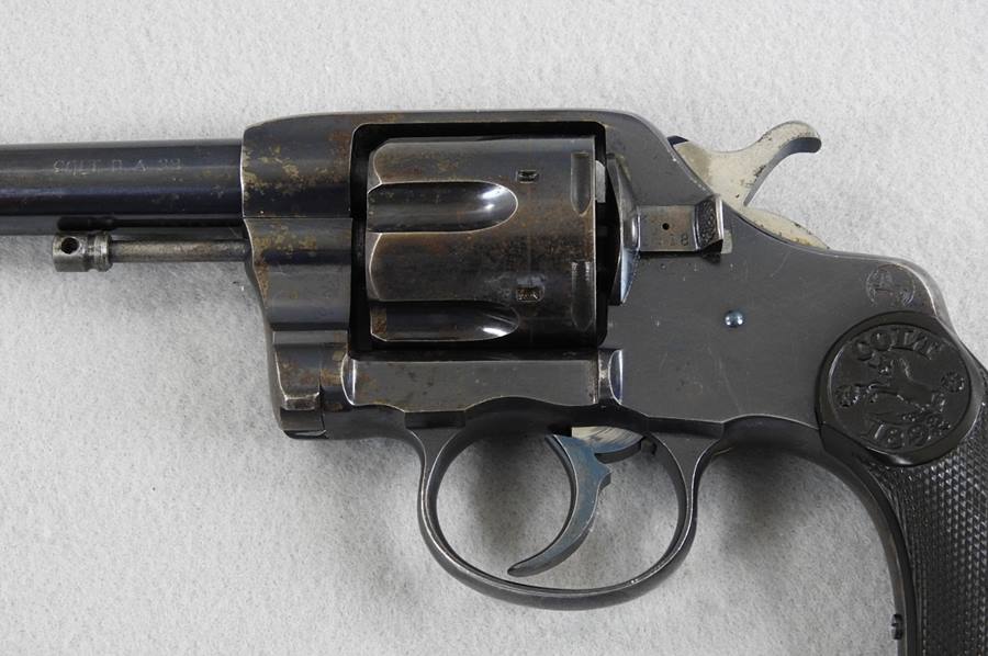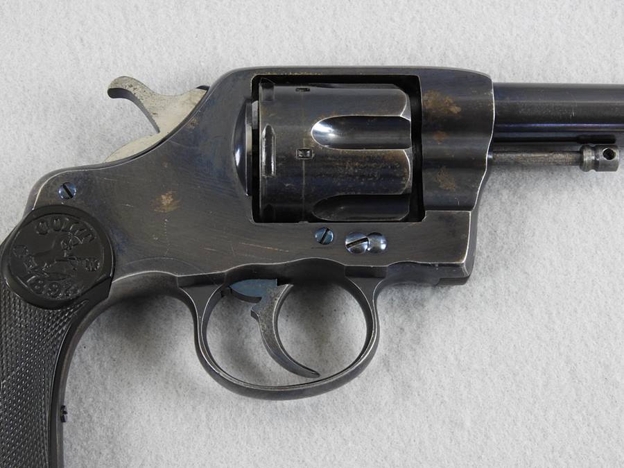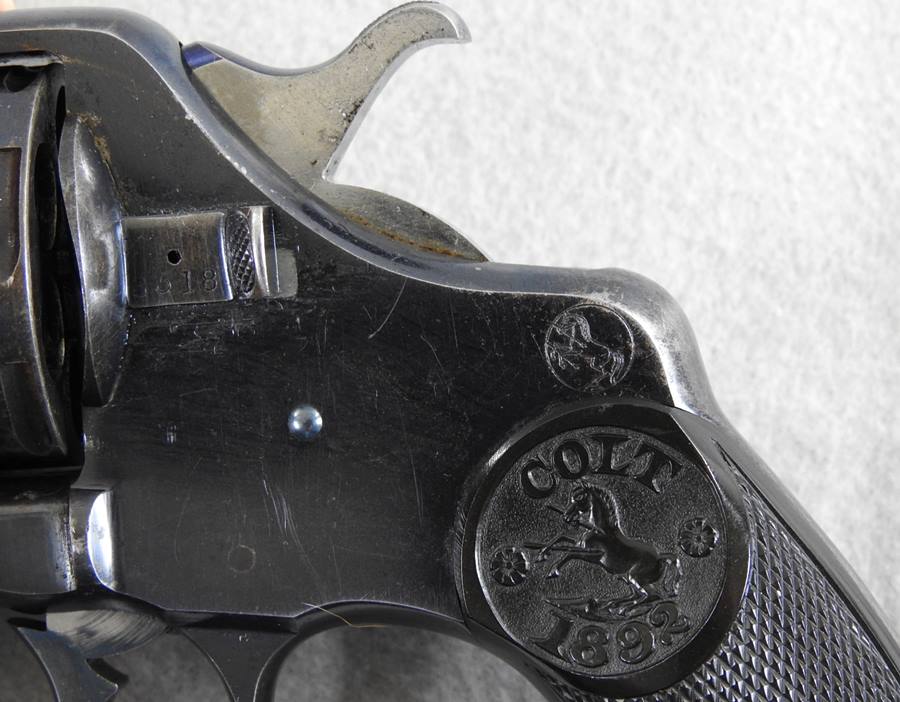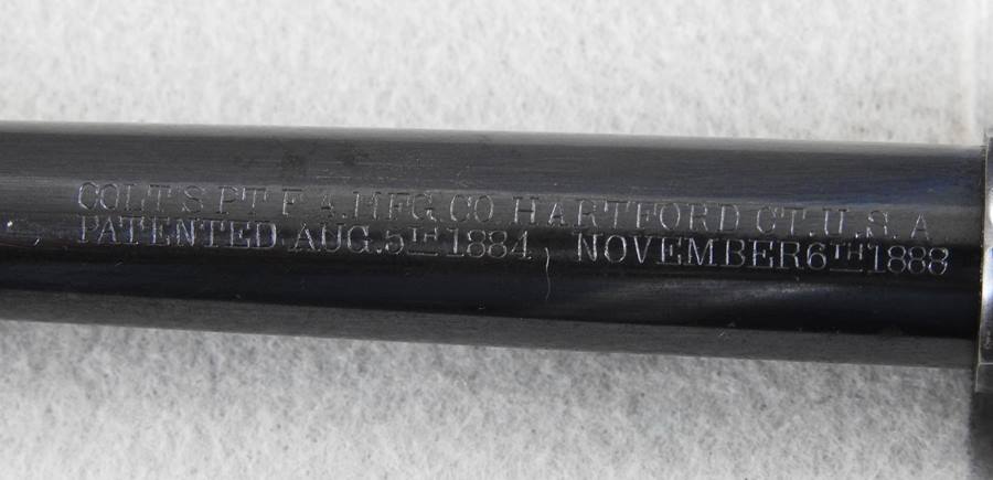 This is a Civilian model 38 Long Colt with SN 11599 and was made in 1894. The bore is very good bright and shiny, and the mechanical function is very good crisp and tight. It retains 80% blue and the grips have nice crisp checkering without any chips or cracks. The 6” barrel address patent dates are 1884 and 1888.