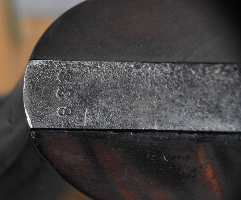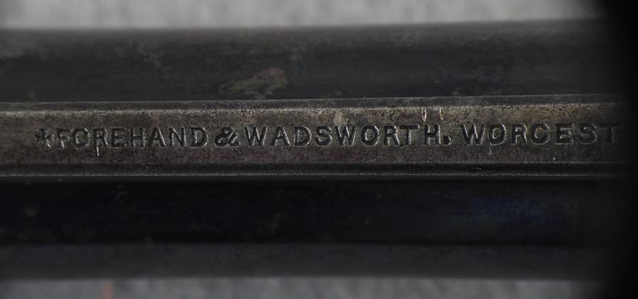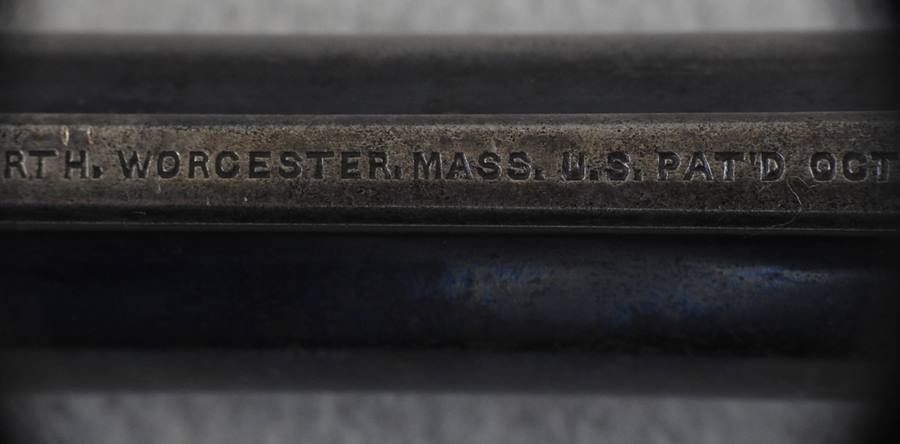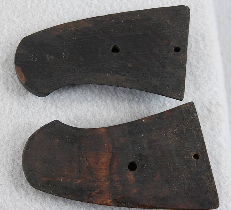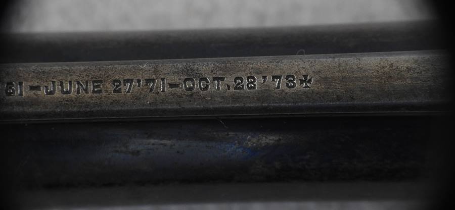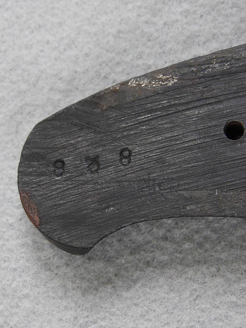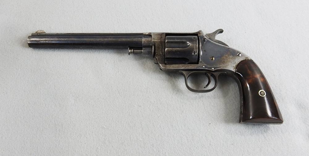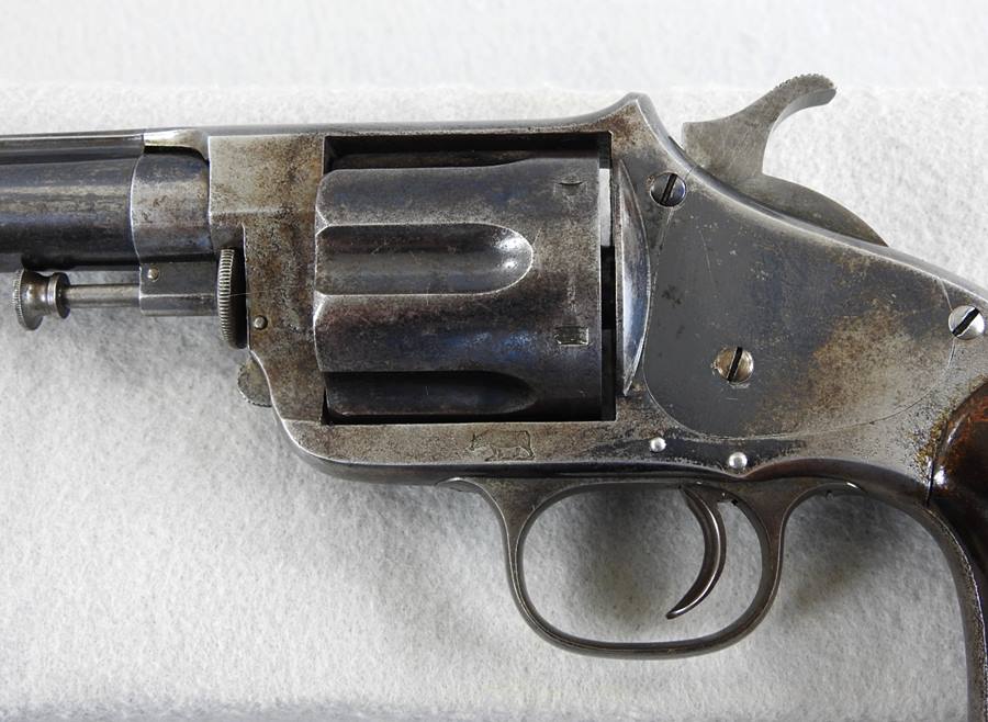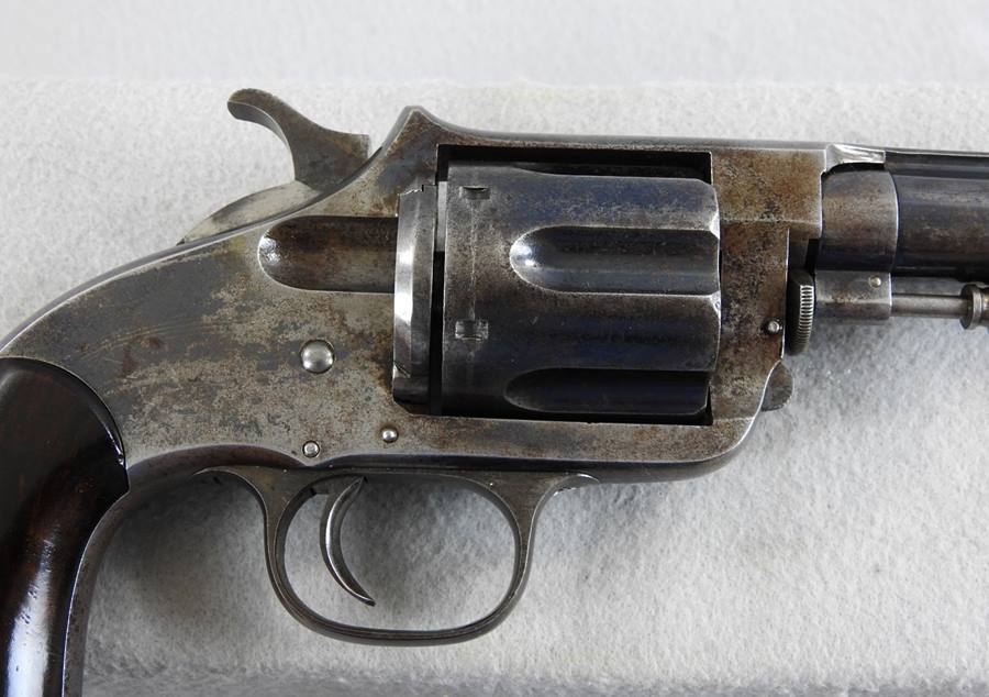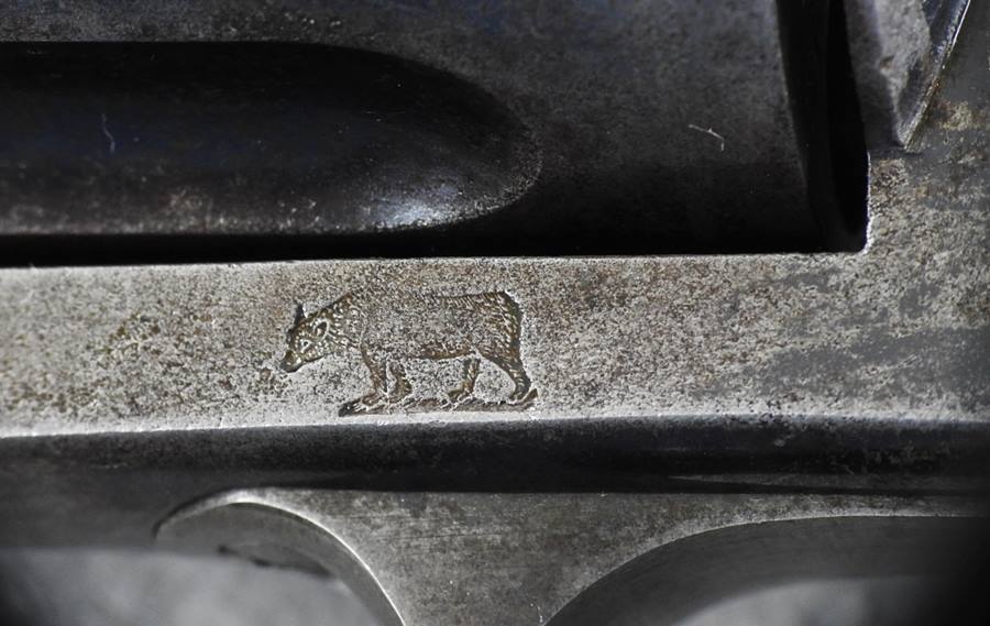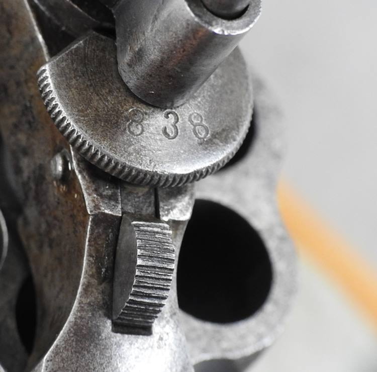 This is a 6 shot 44 caliber Russian centerfire 7 ½” barrel, blue finish and less than 1000 made. This one has a standing bear deeply stamped on the left side frame. The bore is bright and shiny but does show old corrosion. The mechanical function is very good crisp and tight. There is over 35% blue remaining and the serial number is 838.