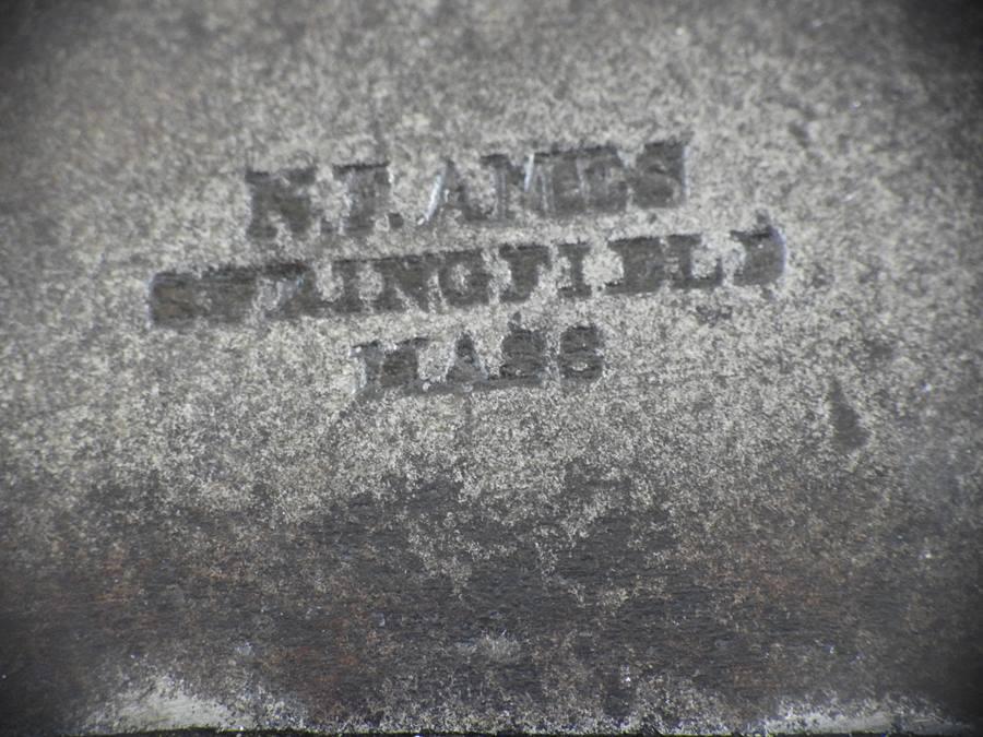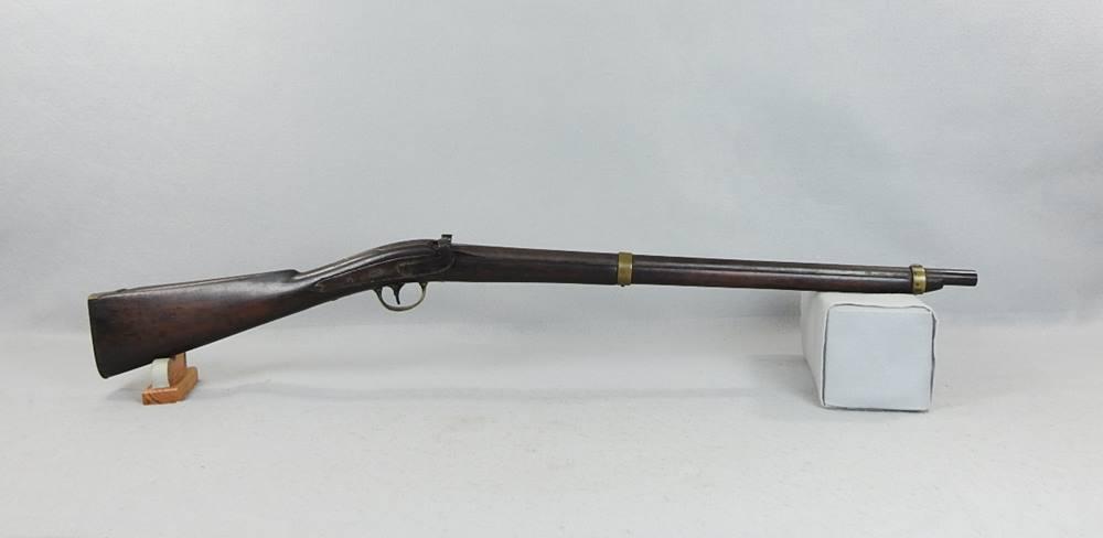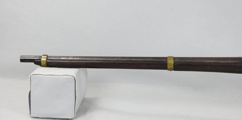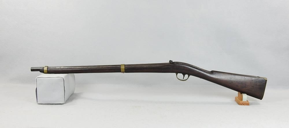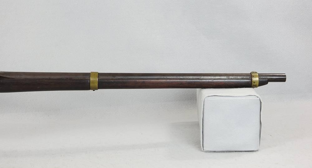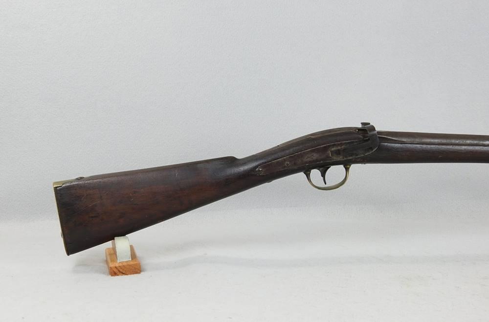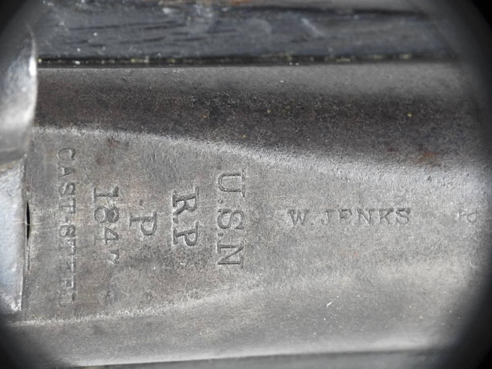This is a 54-Caliber side hammer breech loading carbine a.k.a. “Mule Ear.” It has an oval loading port and a 24 ¼” barrel. The top of the breech is marked Cast Steel and above it the date 1847 above that P above that RP and above that U.S.N. above that W. Jenks. The inside of the loading lever is number 539. With the oval loading port, a paper cartridge with ball and powder could be loaded much quicker than the round ball and loose powder. The mechanical function is very good and tight. The barrel at the muzzle end is pitted but the rifling is very strong and the rest of the bore is bright and shiny.