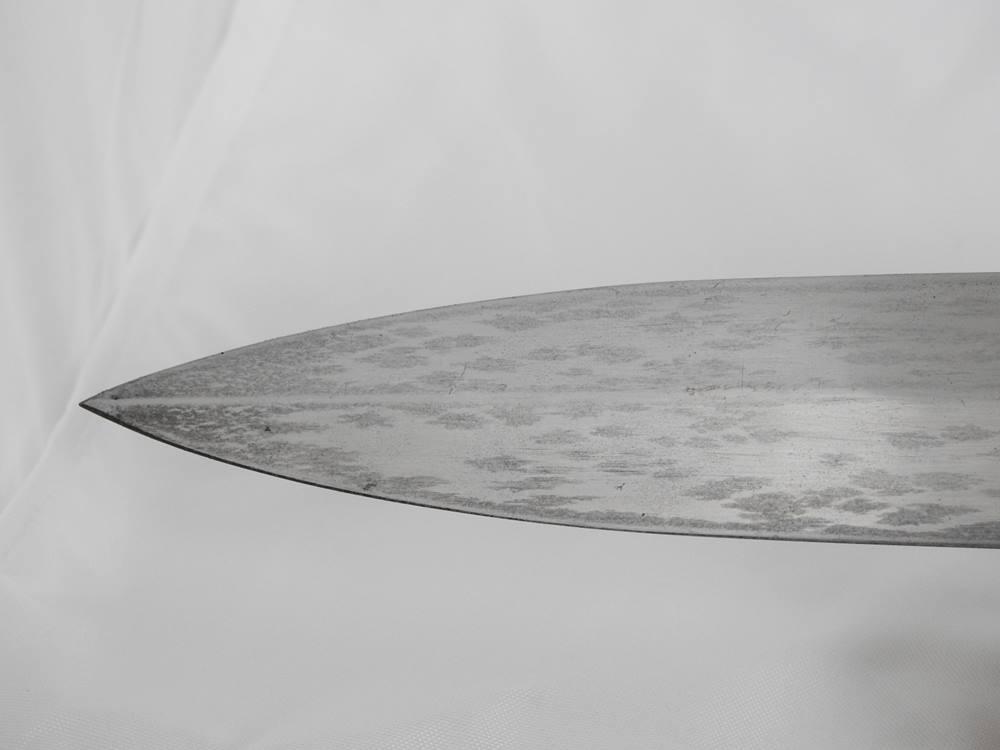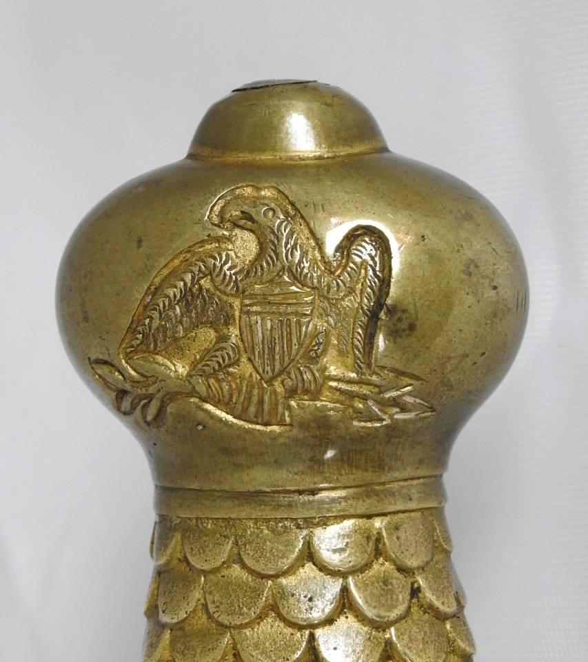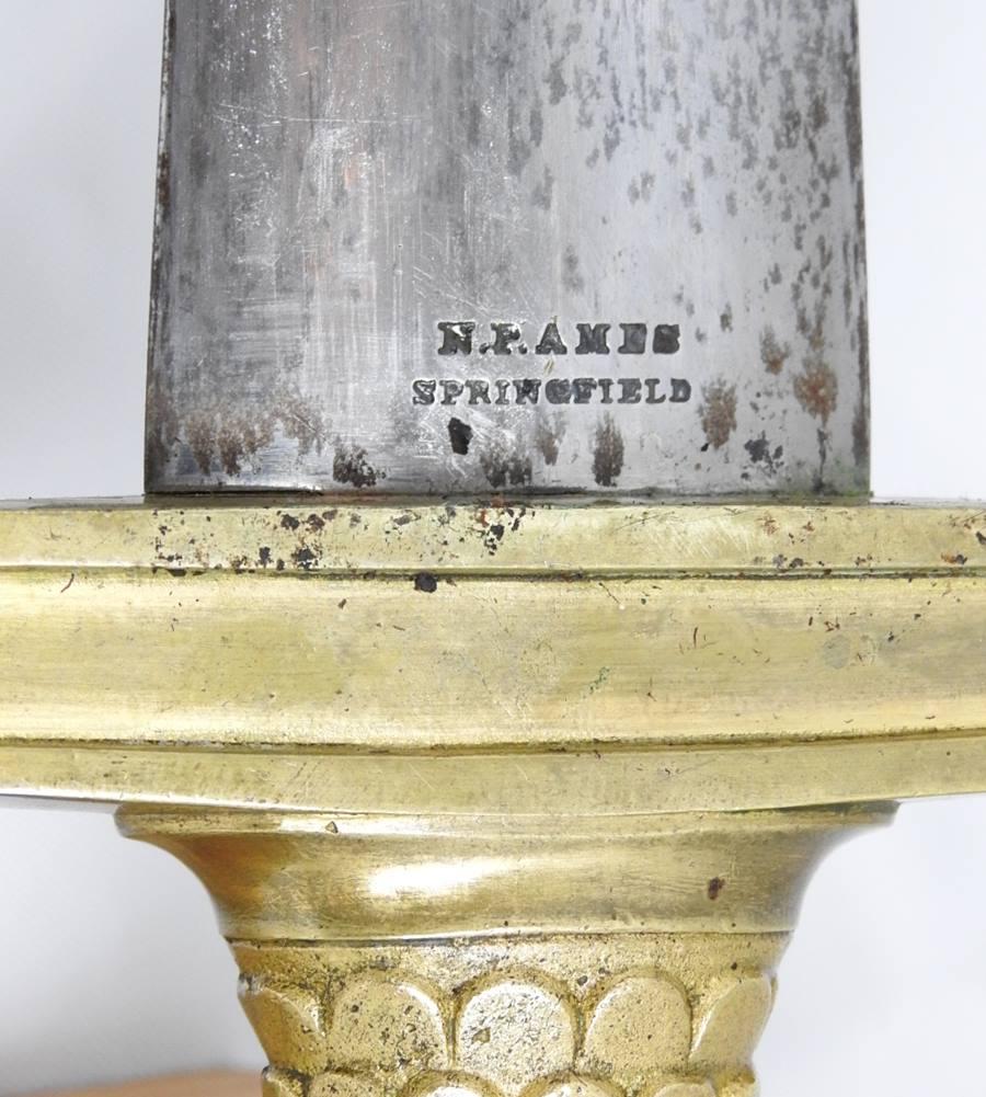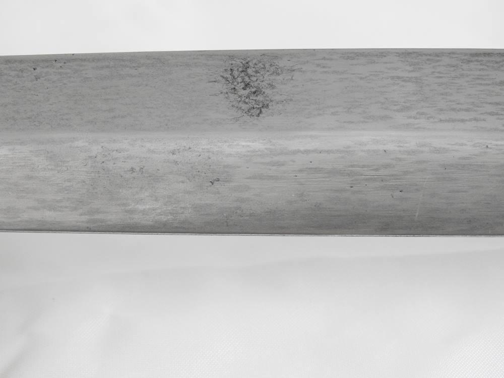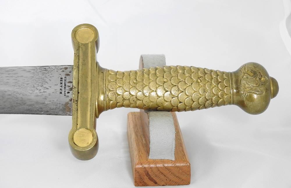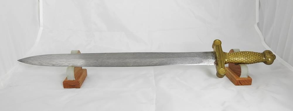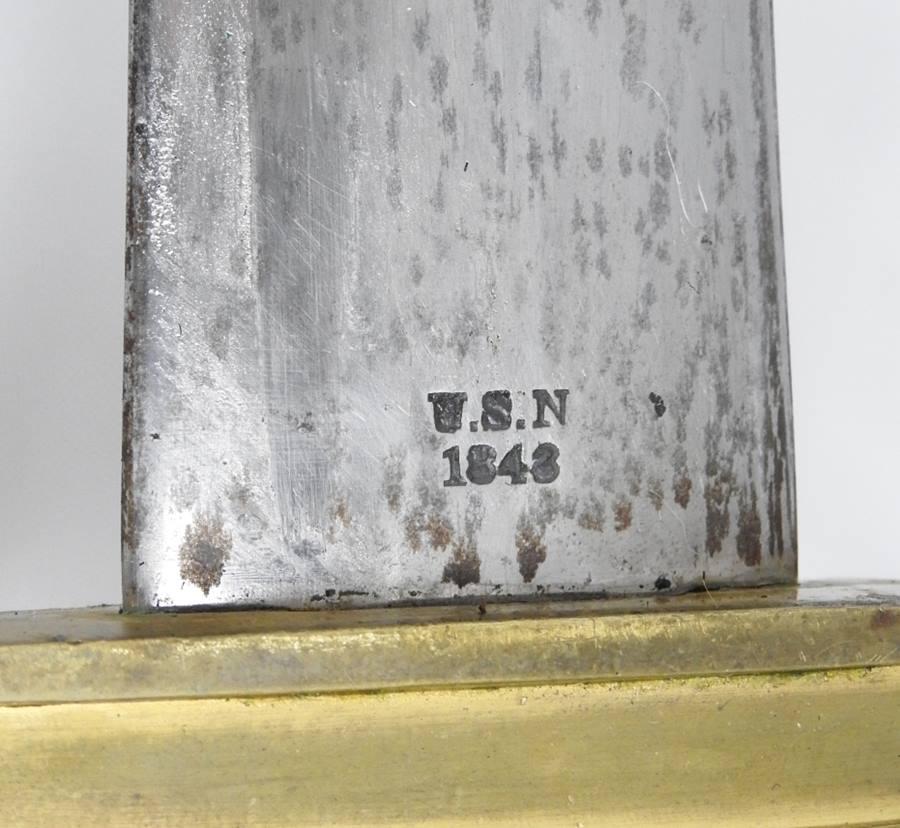 This one does not have a knuckle guard and there are no inspector initials on the grip or guard. It does not have the three handle grip rivets. The blade does not have any fullers but has the same shape as the Model 1841 Naval Cutlass with the knuckle Guard and comes with a leather scabbard with 39 rivets on the front side. On the backside the tip is cracked and the top of the belt loupe cracked and has worn open. The blade is nice with only light stains on both sides.