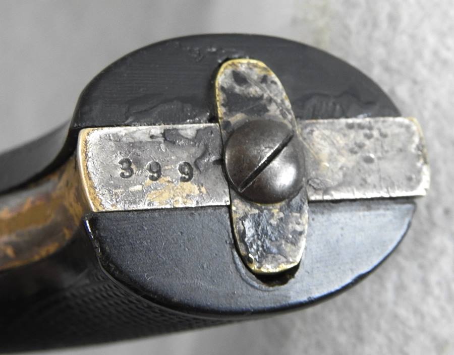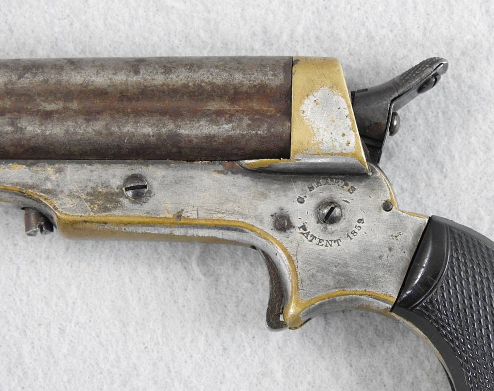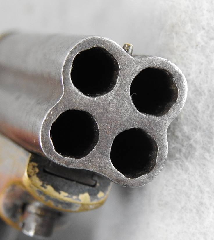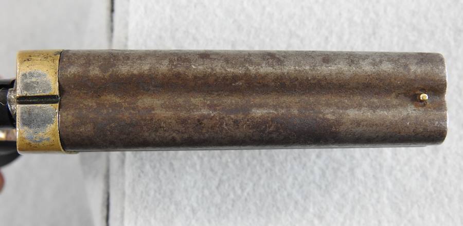 This Sharps Pepperbox retains 45% silver on frame, all original except replaced grips. Matching numbers and the serial number is 399. The mechanical function is fine. The bores bright but do have some corrosion.