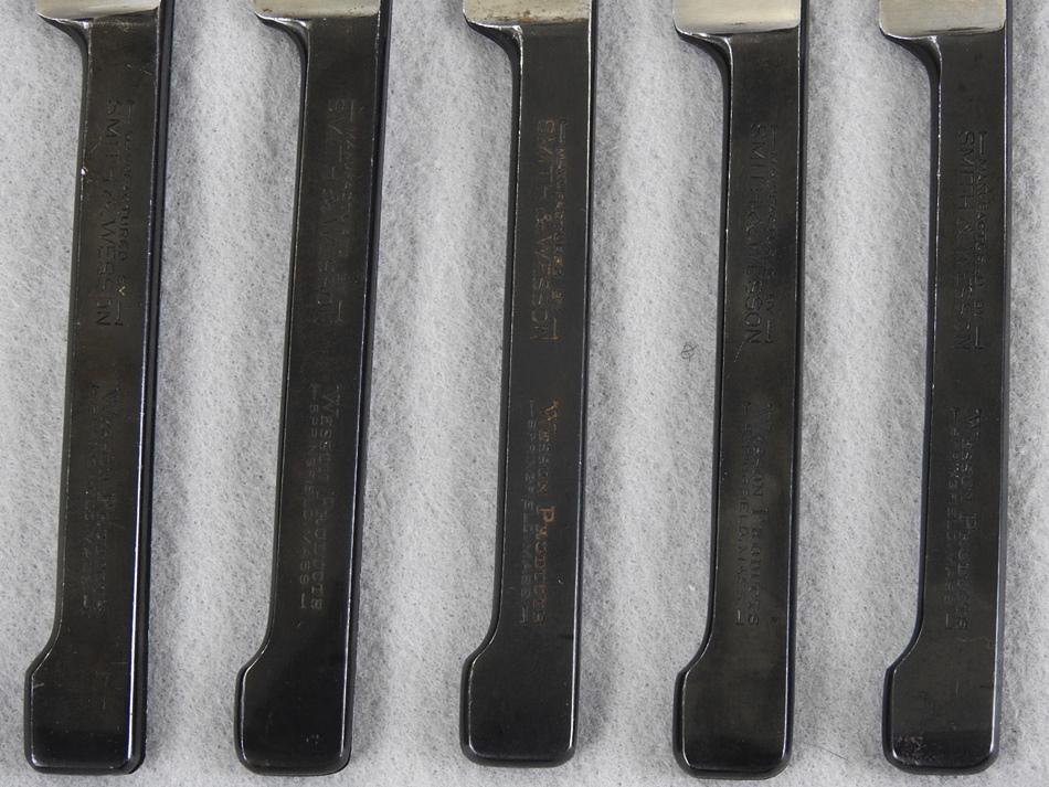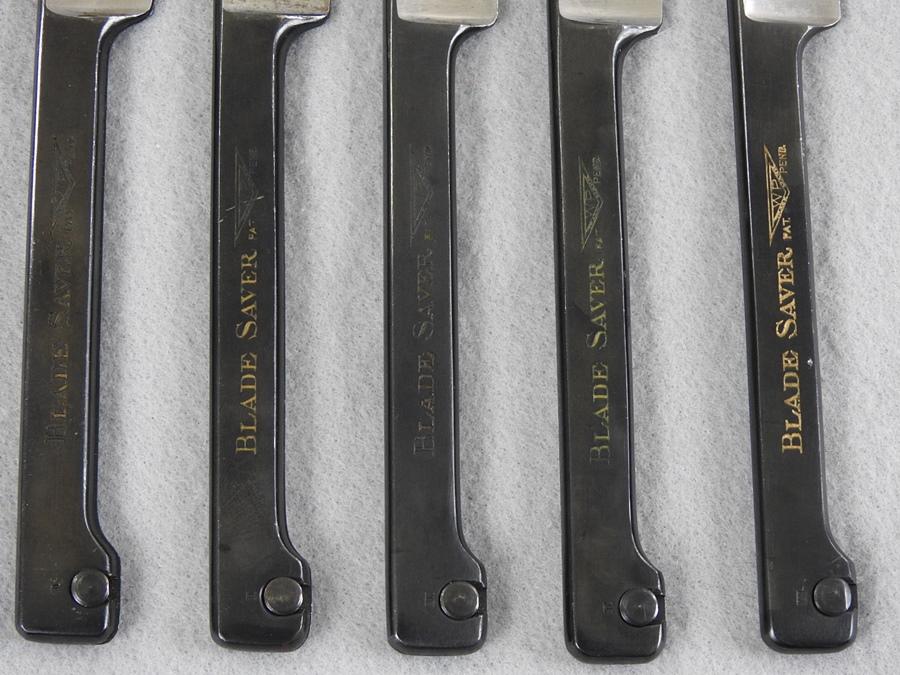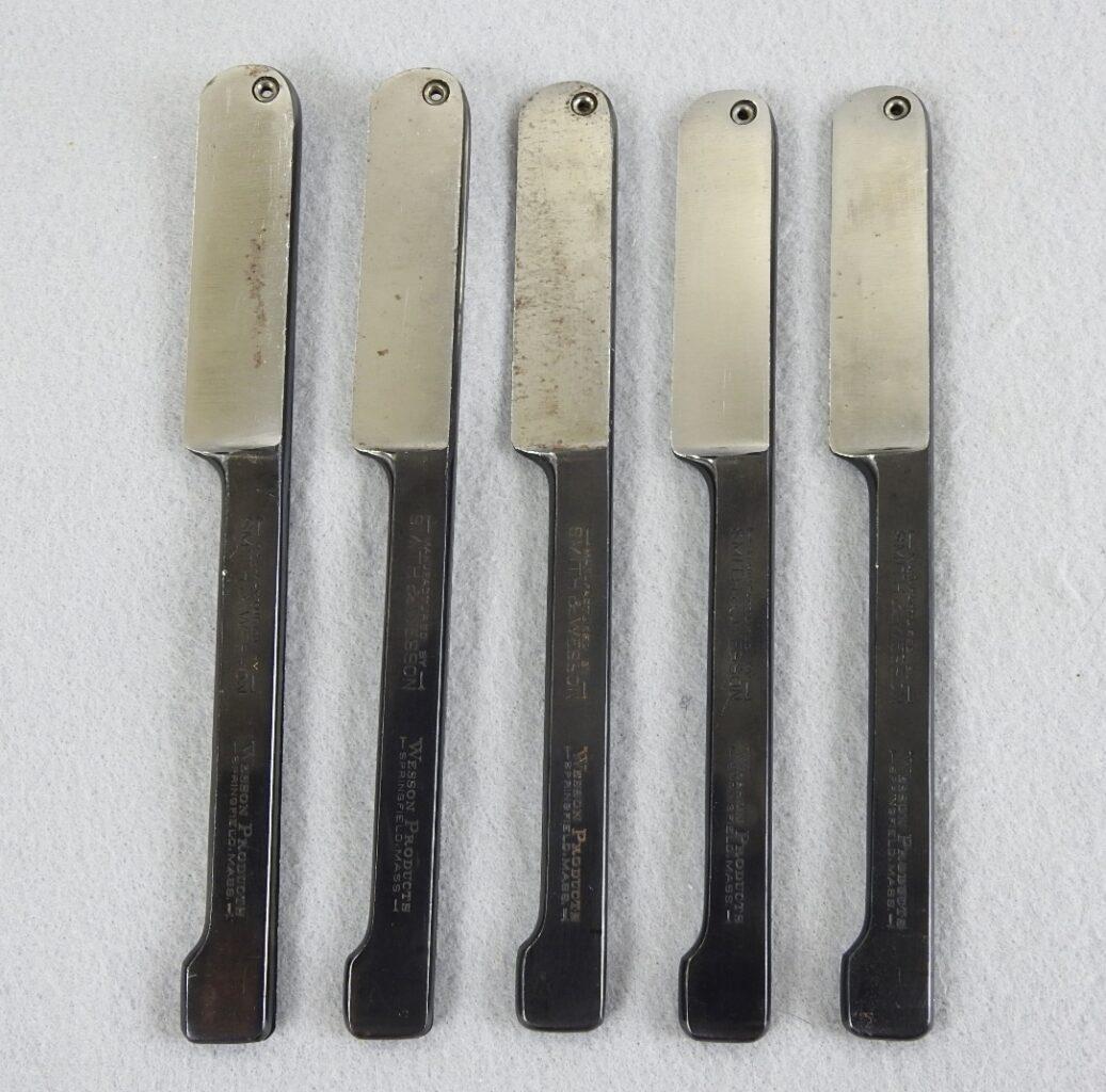 There are 5 Smith & Wesson Blade Saver Shaving Handles $100 Each. There are only 5 of these handles, 3 are marked #1 and 2 are marked #III. The handles are marked Manufactured By Smith & Wesson, Wesson Products Springfield, Mass. and the other side is marked Blade Saver Patent Pending. These are very good plus condition are very Rare and were made in the early 1920s. Each held a straight razor blade and they were stropped with a razor strap to freshen up the edge.