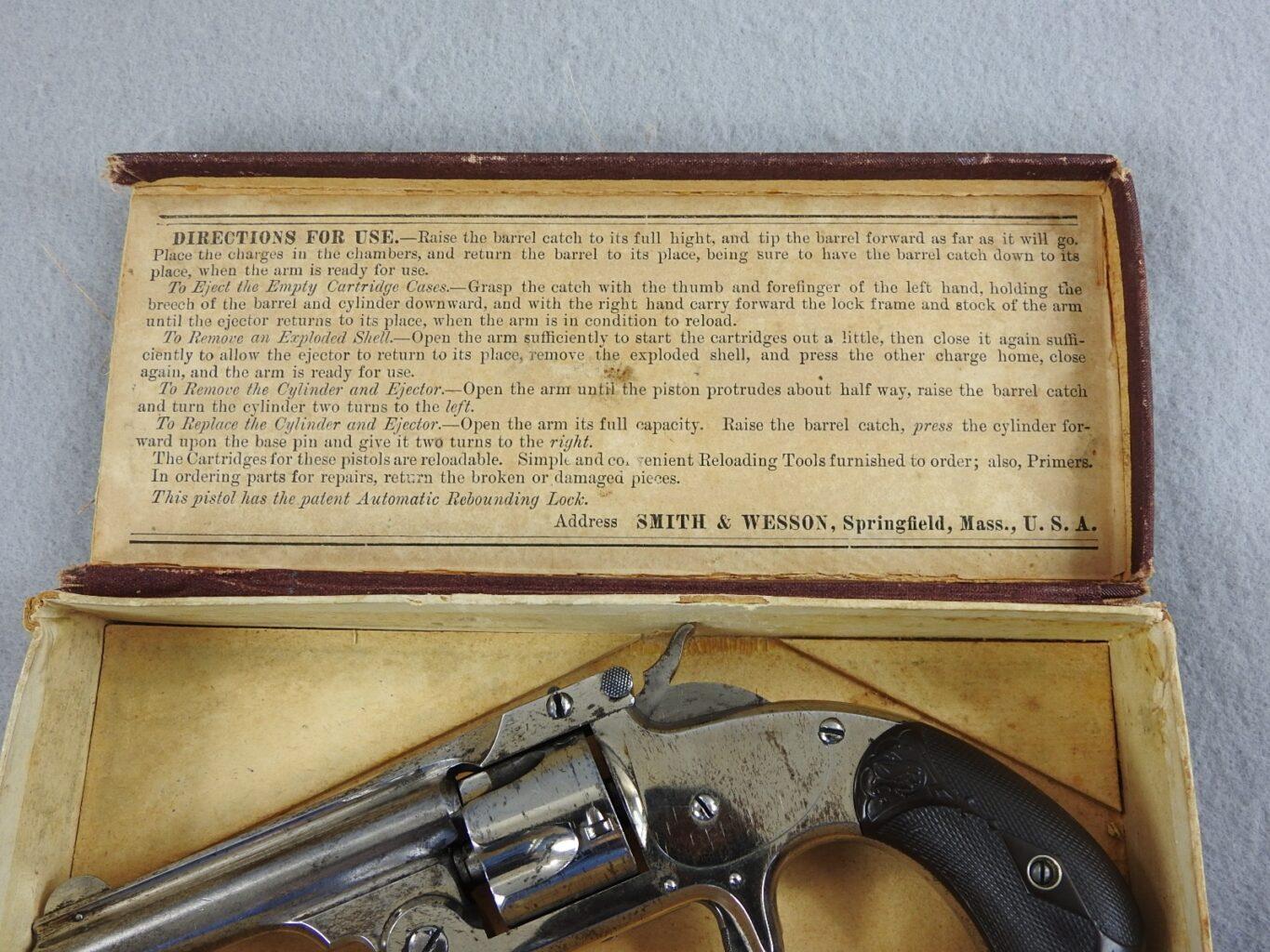 This is a 32-centerfire single action revolver and come with a brown factory box. The box is missing the top right corner of the lid. Other than, that it is in very good condition. The mechanical is very good crisp and tight. The barrel has a very good bright and shiny bore with only small traces of corrosion from the corrosive priming. It retains over 70% nickel finish and no cracks or chips on the grips. The serial number on this 3” barrel revolver is 89368 and is all matching numbers.