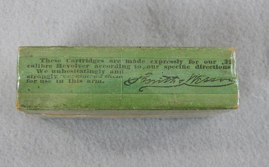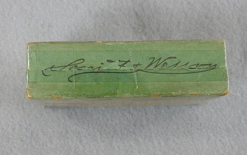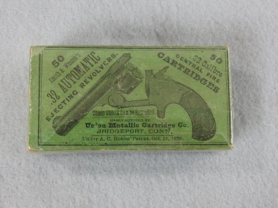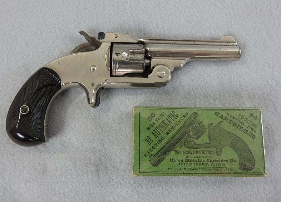 This S&W 1 ½ 32 S.A. 3” with the strain screw and SN 17985. It retains 80% original nickel finish with crisp mechanical function. The bore is very good bright and shiny but does have The grips are very fine plus no chips or cracks. All of the markings are sharp and crisp and comes with an empty box of 32 S&W central fire with a picture of a S&W 1 ½ on the empty box and made by Union Metallic Cartridge Co. The bore is very good with traces of corrosion from the black powder priming.