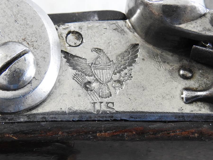 This has a lock date of 1806 and only 300 were made and this is #7. The rear of the lock has Harpers Ferry 1806 and the middle of the lock has a wonderful Spread Eagle with US under it. This is 54 caliber and the barrel is 10 1/16”. The ram rod has a brass augur tip. The serial number is 7, and the barrel Eagle Head over P with US and the number 7. RARE. This appears to be an original Flintlock pistol with very good mechanical function and very crisp markings. This one is in fine plus condition.