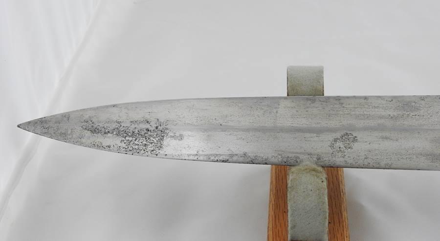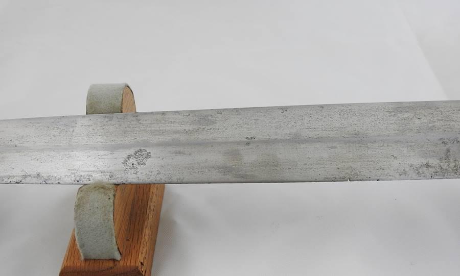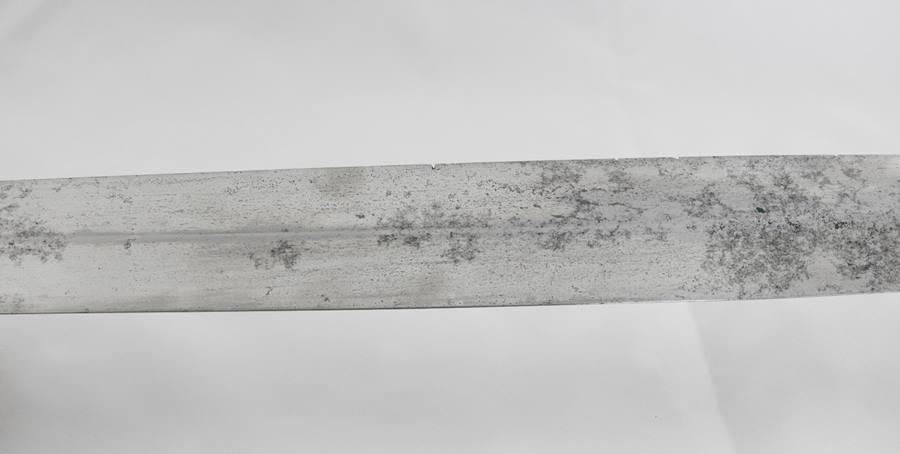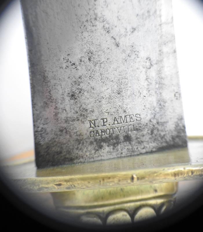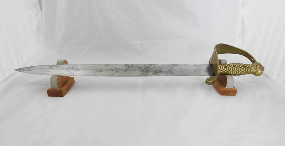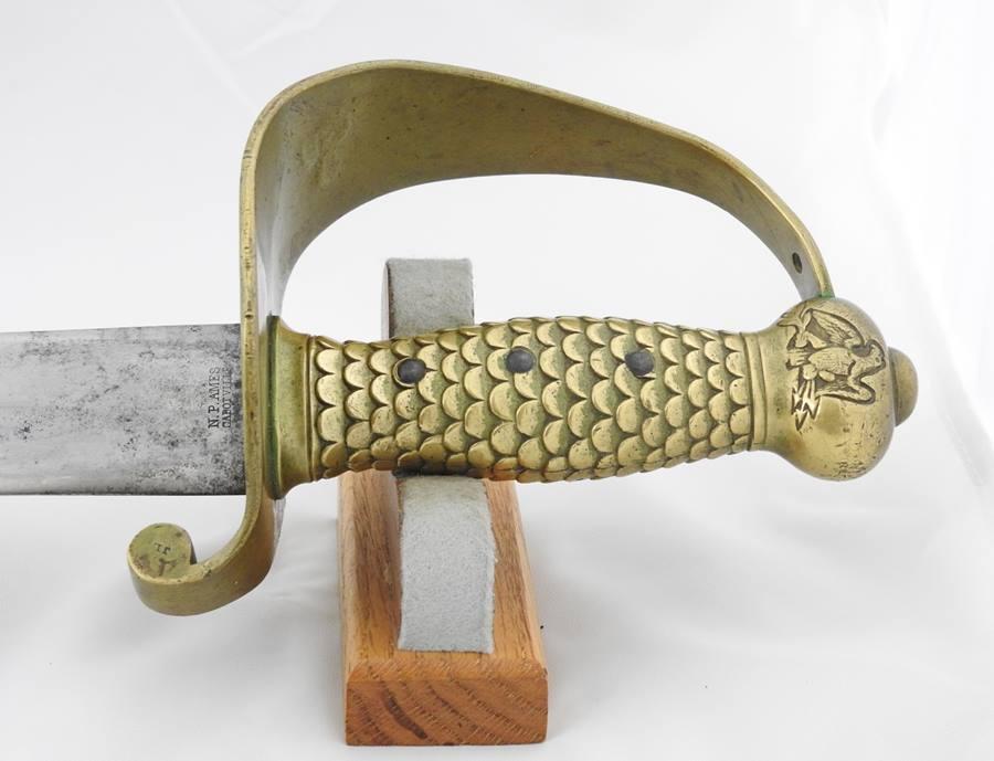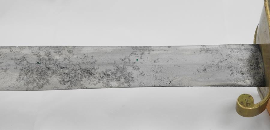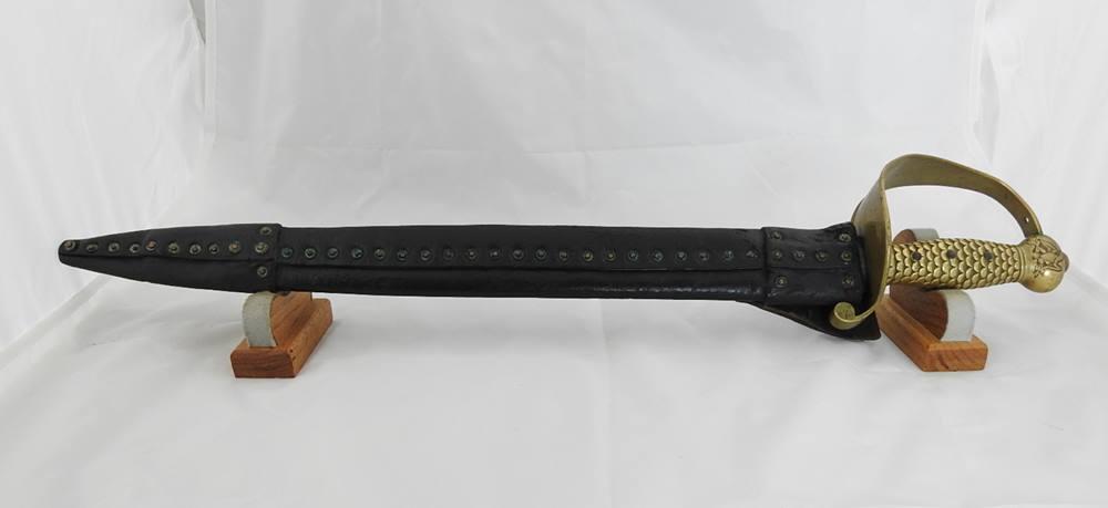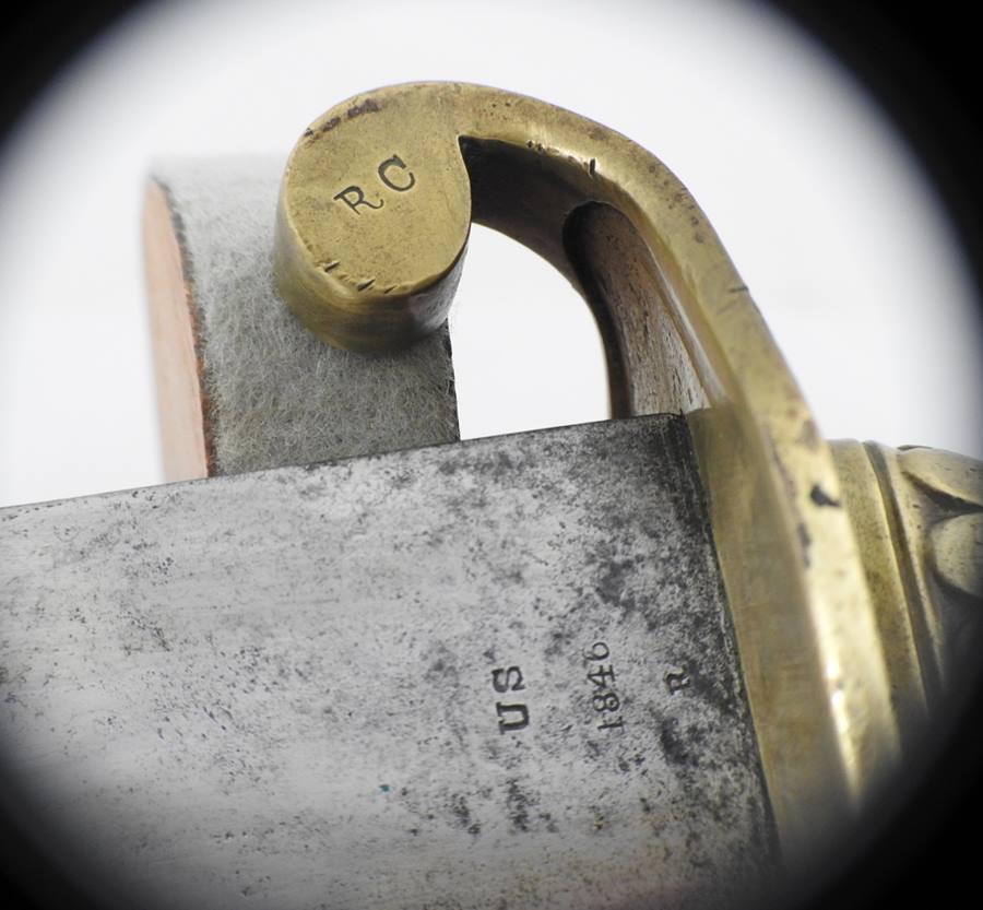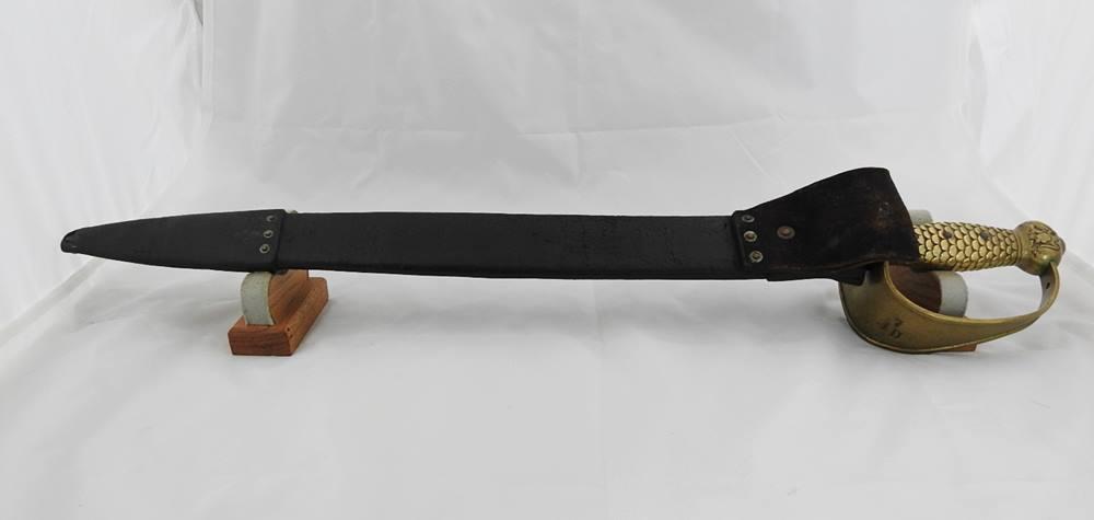 This Sword is dated 1846 with a 7 1 D rack number and is RC on the left and JL on the right inspected and stamped on the curl above Ricasso. The blade is 21” long 1 11/16” wide and 26 ½” overall in length. The blade is in fine condition with only a few light stains. This sword comes with a very nice leather scabbard with 41 copper rivets on the face side from tip to top of the throat.