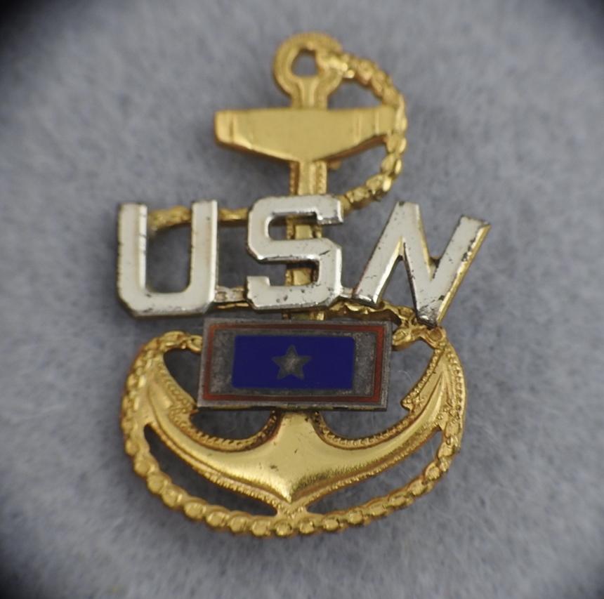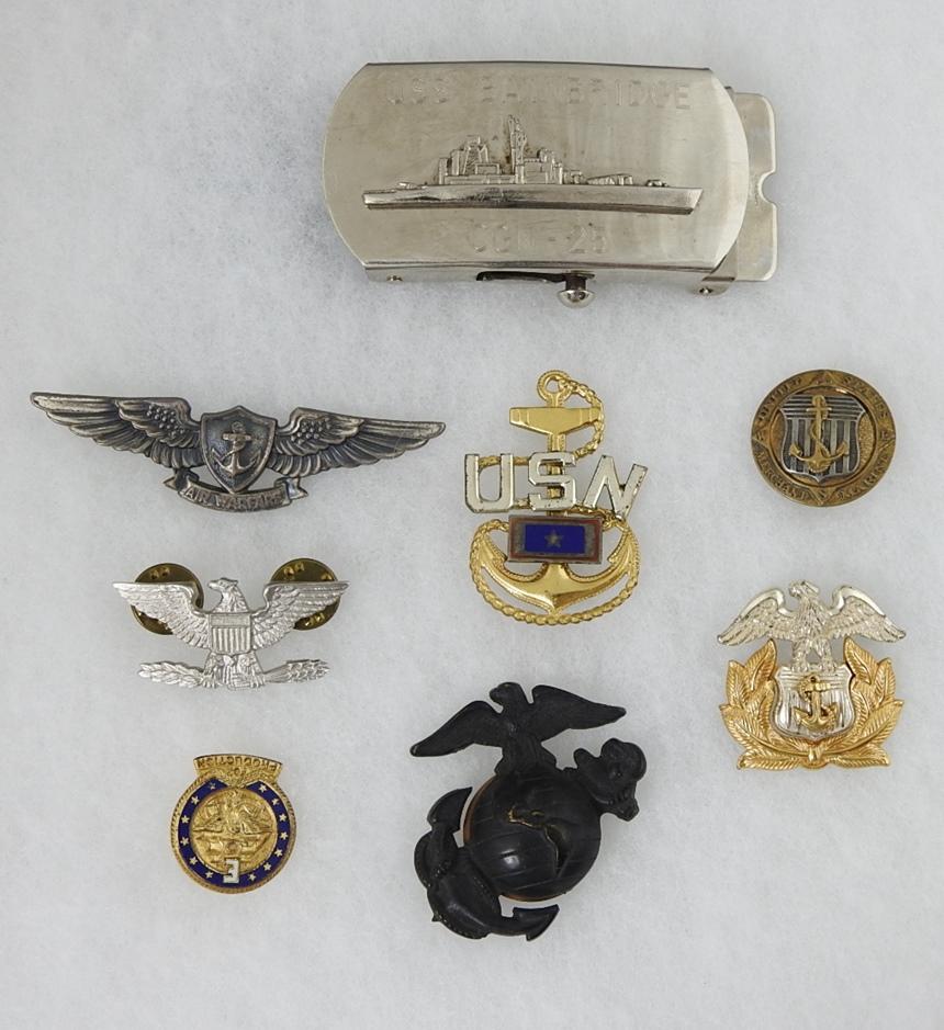 This Lot includes Original: 5 U.S. Navy, 1 Bronze Marine Corp. Badge, 1 US Navy Award pin. 1 USS Bainbridge Belt buckle. CGN-25