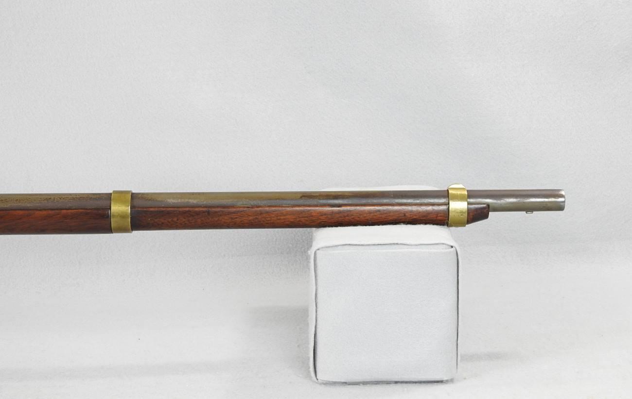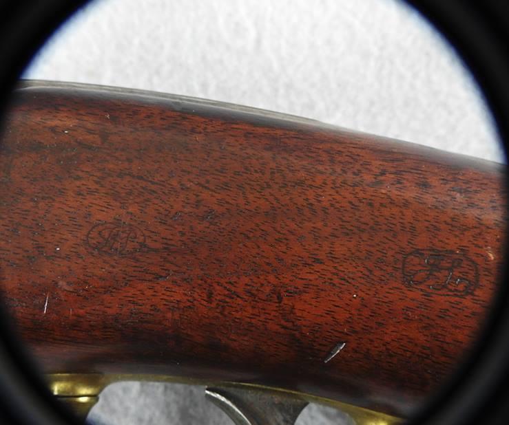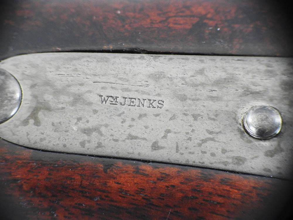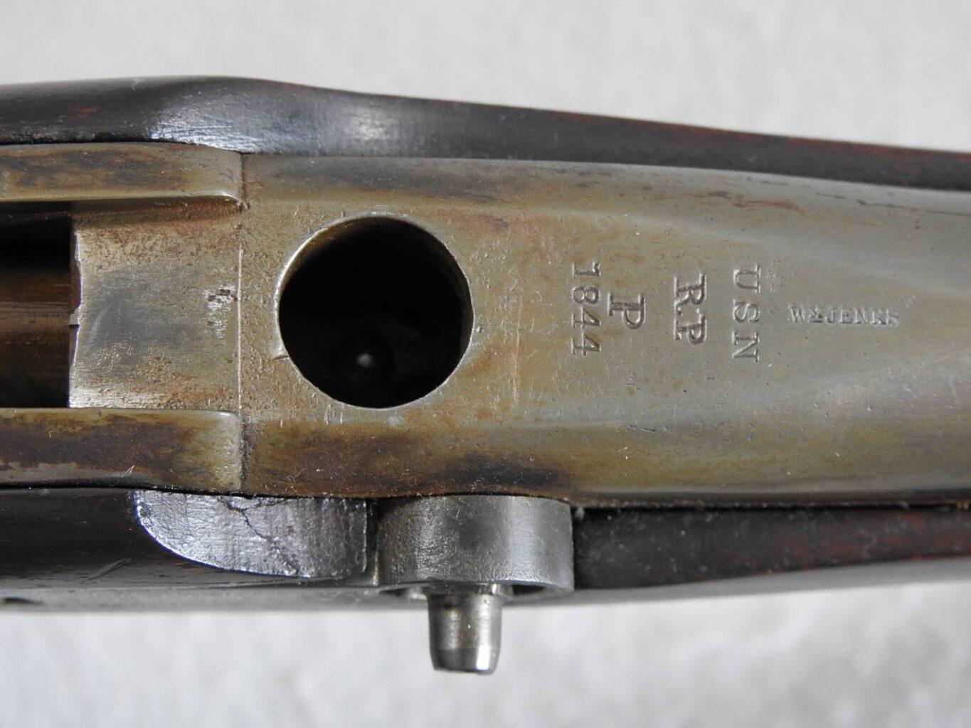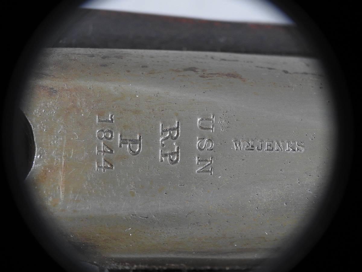 The barrel retains over 50% brown and still has nice traces of case colors. The breech is marked Wm Jenks USN over RP over P over 1844. There are two stock Cartouches JP and JL. The butt plate two is stamped P, the bottom of the trigger guard has P and behind the trigger guard on the flat grip is stamped P. The loading lever is numbered #415. There are two stock Cartouches JP is John Pope and RP for Richard Paine or Richard Parker. The mechanical function is very good crisp and tight and the smooth bore is good to very good with only a small amount of corrosion.