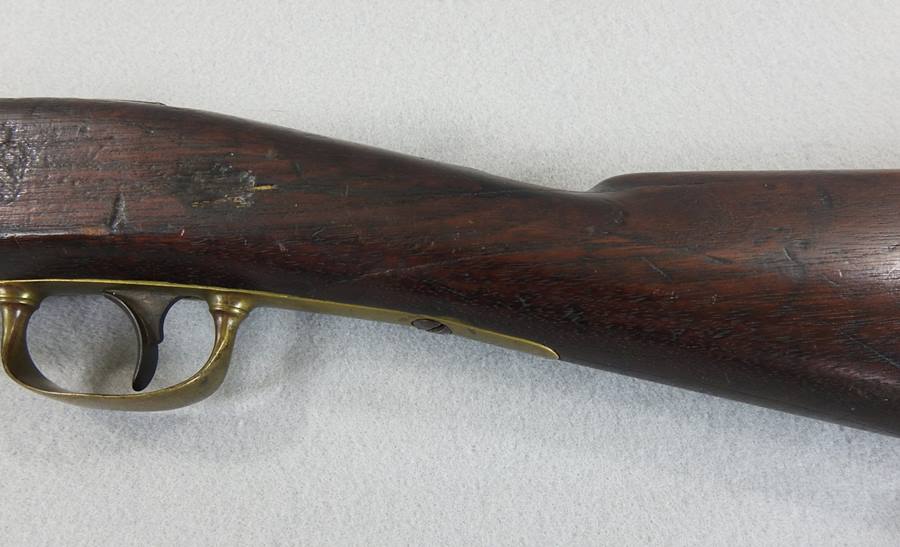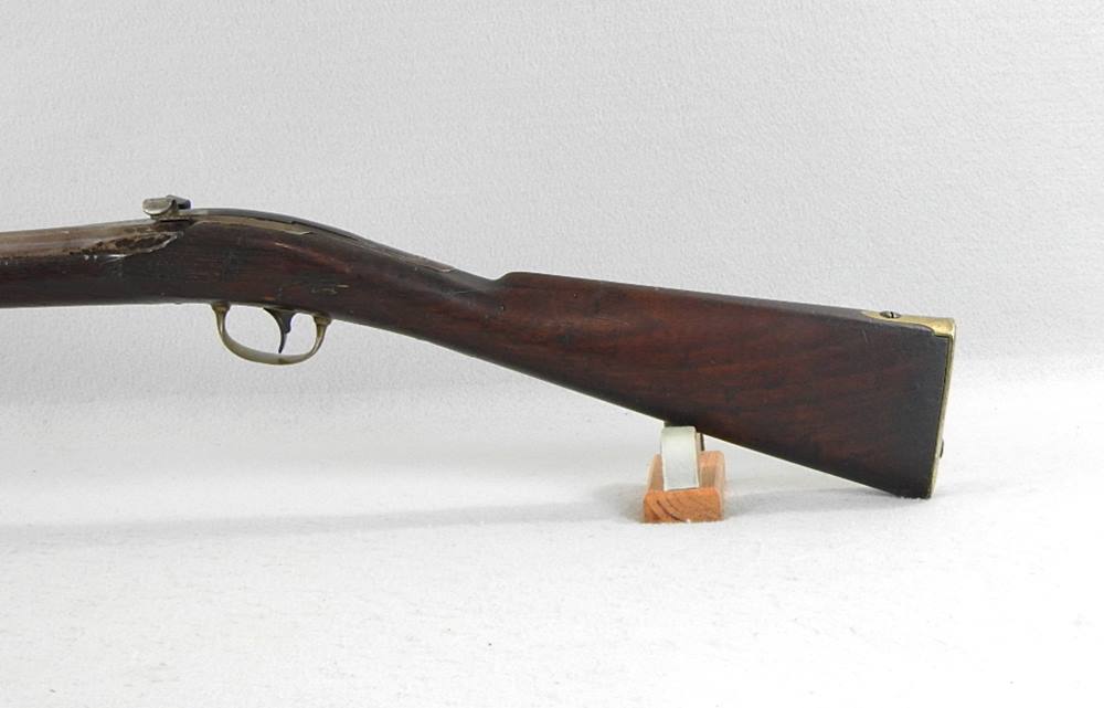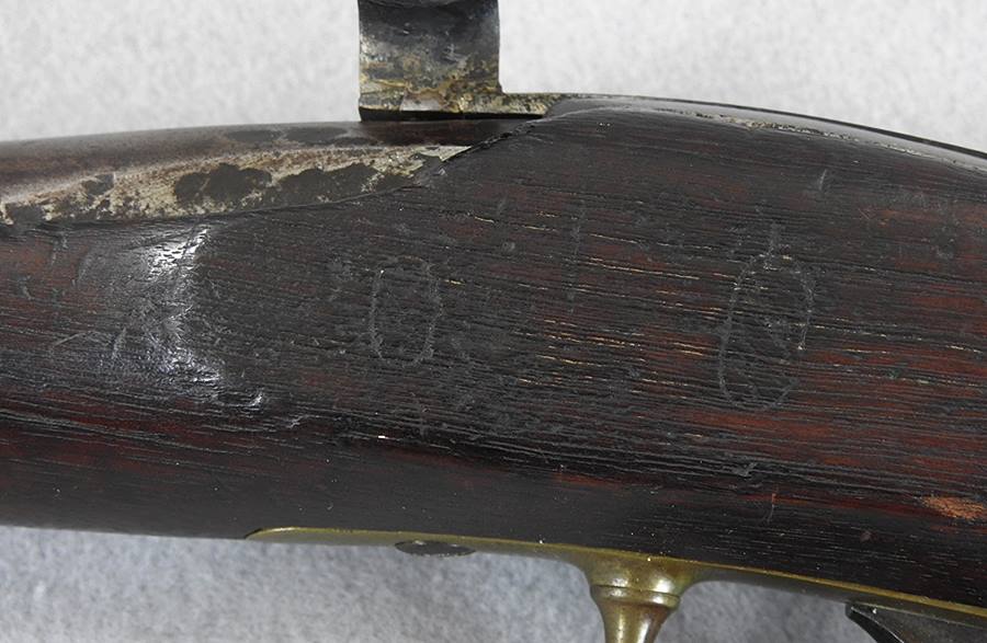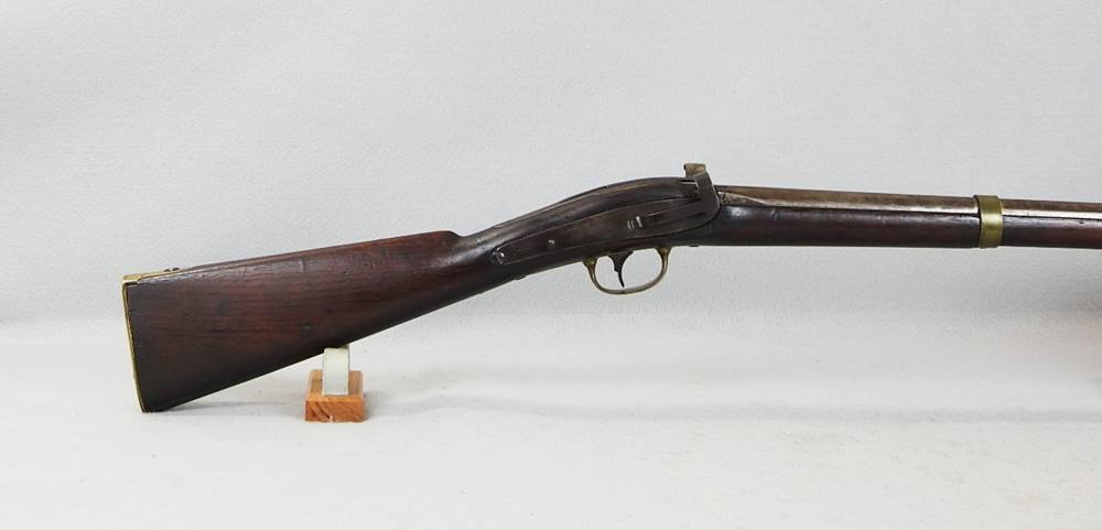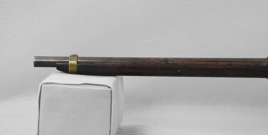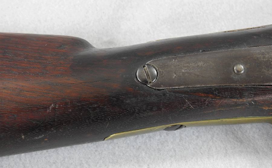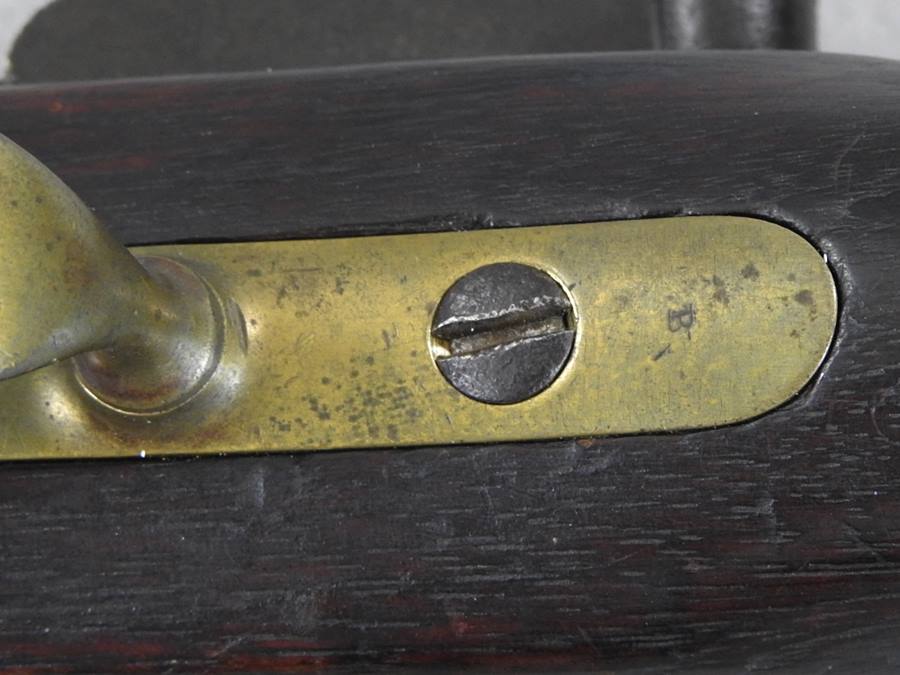 This is a very RARE Mule Ear USR Cutter Jenks Carbine, 24 ¼” length barrel with 2 brass barrel bands. It has a breach loading round loading port. The markings are very good and clear. 1844 dated, inspector marked JCB with P and USR, Wm. Jenks and two Inspector Cartouches on the left wood flat. It has two nicely repaired wood cracks on the left side that run the same direction as the grain of the wood. The brass trigger guard has a B inspector mark and the brass butt plate has a B inspector mark. The mechanical function is very good and the smooth bore barrel does have some corrosion.