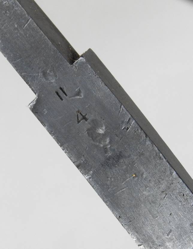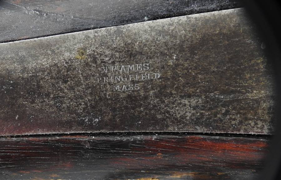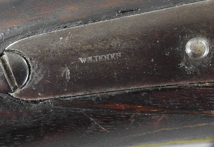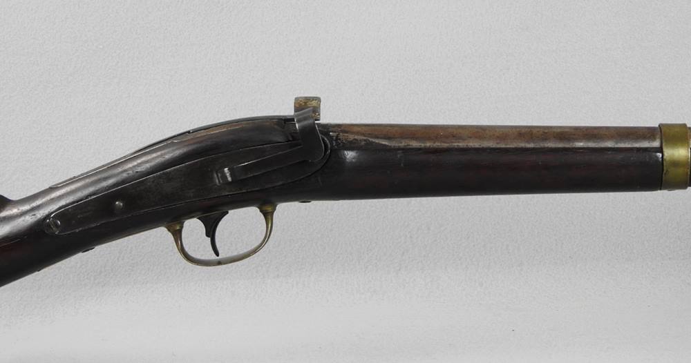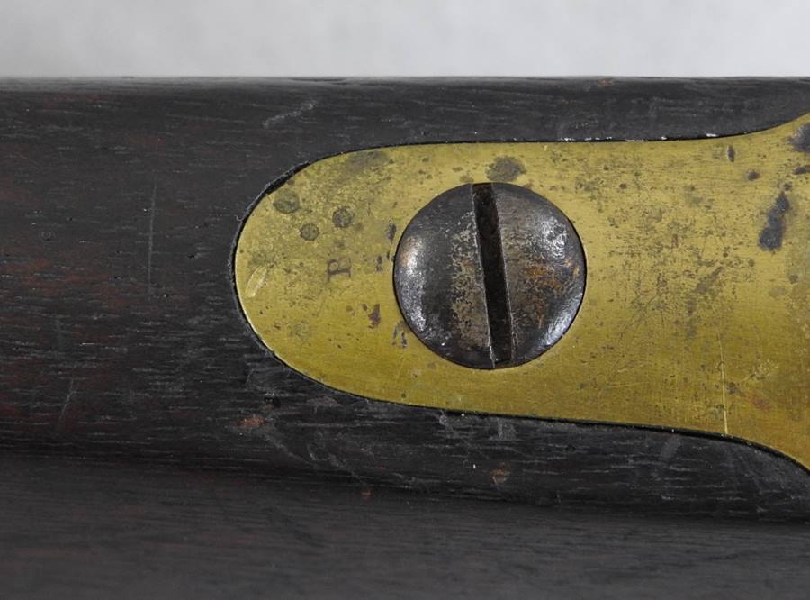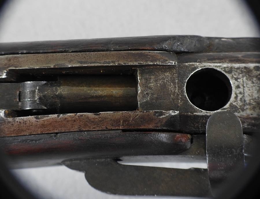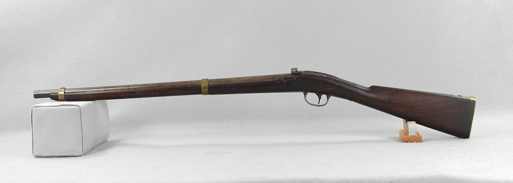 This is a very RARE Mule Ear USR Cutter Jenks Carbine, 24 ¼” length barrel with 2 brass barrel bands. It has a breach loading round loading port. The markings are very good and clear. 1844 dated, inspector marked JCB with P and USR, Wm. Jenks and two Inspector Cartouches on the left wood flat. It has two nicely repaired wood cracks on the left side that run the same direction as the grain of the wood. The brass trigger guard has a B inspector mark and the brass butt plate has a B inspector mark. The mechanical function is very good and the smooth bore barrel does have some corrosion.